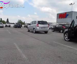 Exibitionistische tranny dildo neukt zijn homo aars op een publieke parkeerplaats